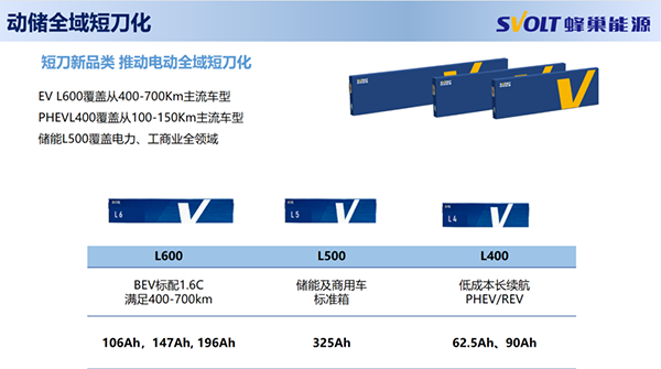 在杨红新看来,平台化将是电池企业降低成本、提高产业效率的核心解决方案。蜂巢能源致力于将全新电池品类——短刀电池,打造成最具竞争力的代表性产品,并将实现动力+储能全域短刀化,产品涵盖从L300-L600的全尺寸短刀电池产品,覆盖从乘用车到储能、商用车、工程机械、非高速电车等全域使用场景。