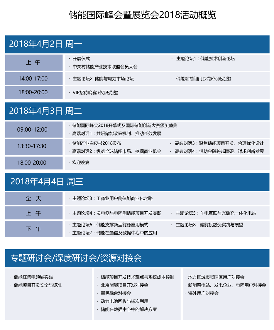 “储能国际峰会暨展览会(ESIE)”是在国家能源局科技装备司指导下,在中关村管委会、中国能源研究会支持下,由中关村储能产业技术联盟(CNESA)打造的储能产业专业品牌会展。“储能国际峰会暨展览会2018(ESIE2018)”将于2018年4月2-4日在国家会议中心隆重举行,2018年峰会将在今年的基础上进一步升级,本次展会将规划出6000平米展示区,设置100+展位,同期将举办国际储能创新大赛和新品发布会,储能全产业链的领头企业将集中... [查看详细]