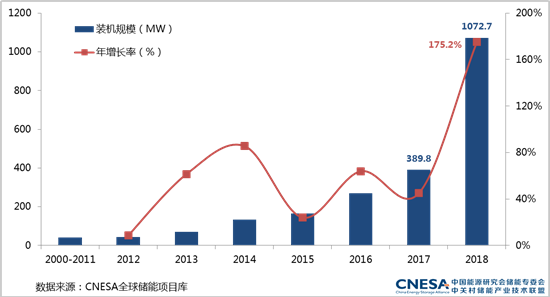 图1:全球电化学储能市场累计装机规模(2000-2018)