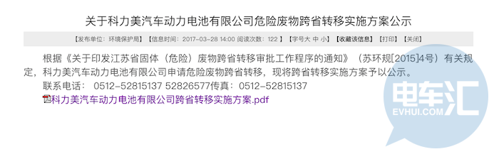 常州市环境保护局的一则公示显示,科力美汽车动力电池有限公司跨省运输动力电池,严格按照危险废品运输来管理,严格规定了运输路线、运输人员及应急预案等。
