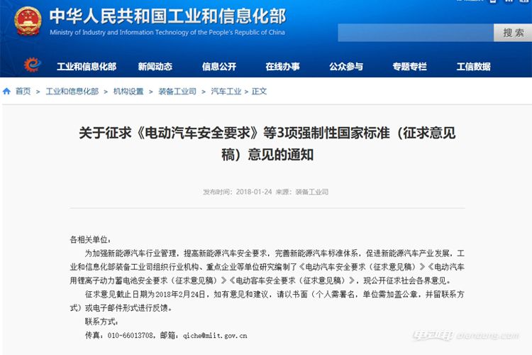 近日,工信部发布征求《电动汽车安全要求》、《电动汽车用锂离子动力蓄电池安全要求》、《电动客车安全要求》3项强制性国家标准(征求意见稿)意见的通知,公开征求意见的时间截止至2月24日,这意味着纯电动车的安全要求将有国家标准可依。