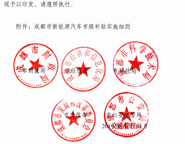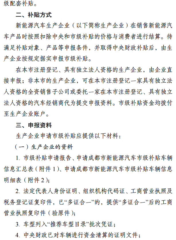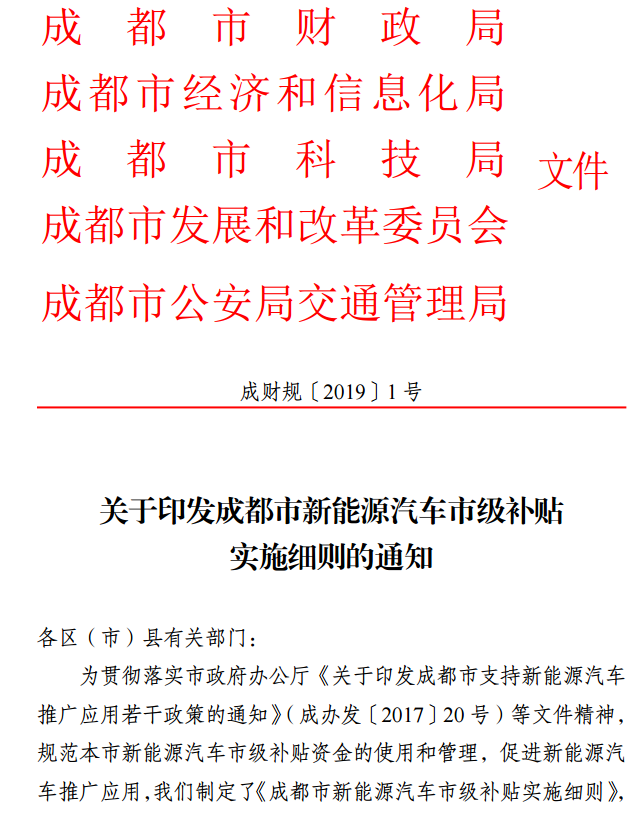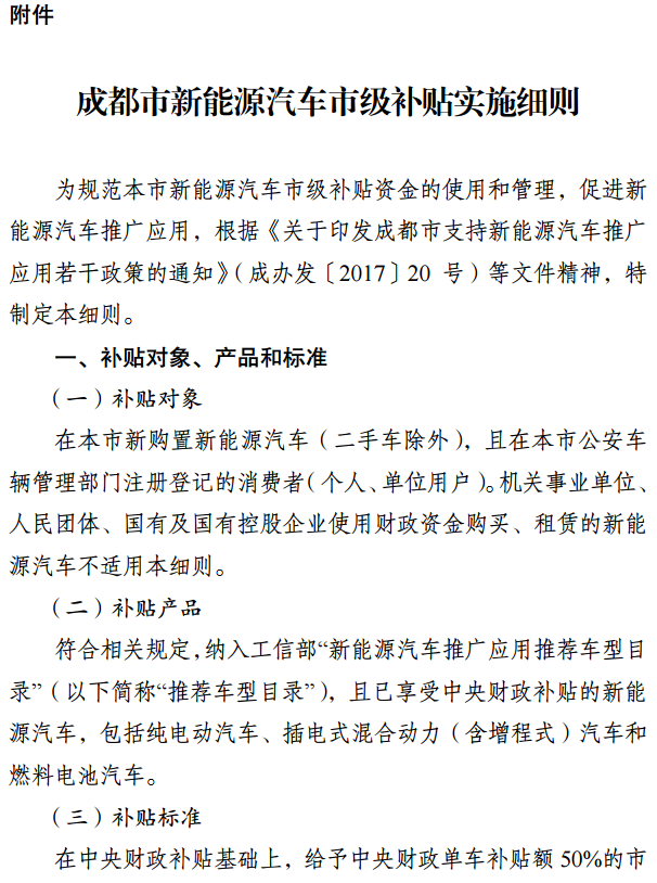 近日,成都市财政局等5部委联合印发的《关于印发成都市新能源汽车市级补贴实施细则的通知》指出,在中央财政补贴基础上,给予中央财政单车补贴额50%的市级配套补贴。