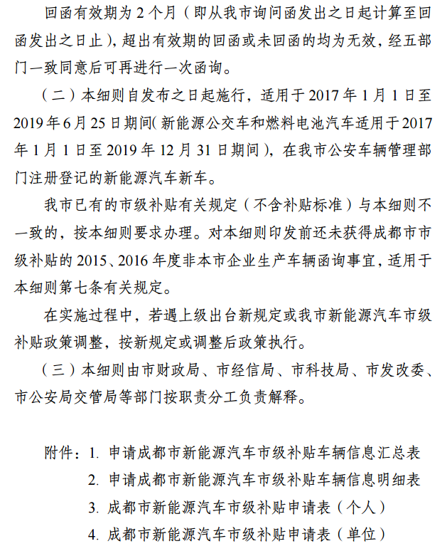 实施细则自发布之日起施行,适用于2017年1月1日至2019年6月25日期间(新能源公交车和燃料电池汽车适用于2017年1月1日至2019年12月31日期间),在成都市公安车辆管理部门注册登记的新能源汽车新车。
