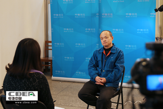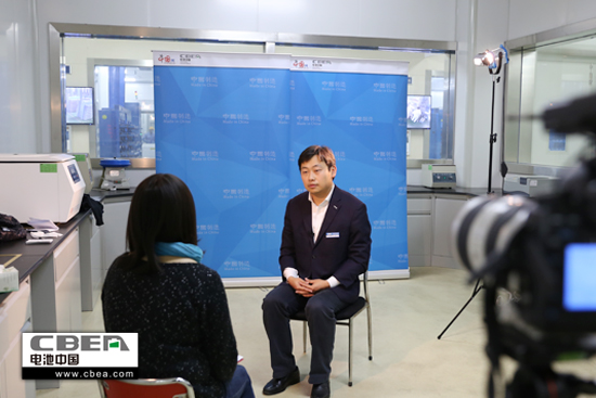 图为超威电源有限公司市场部总监杨享川接受采访