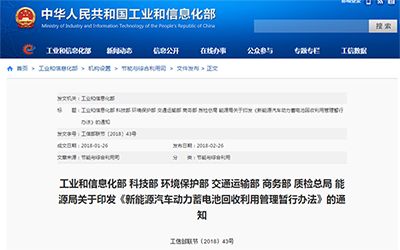 2月26日,国家工信部、科技部、环境保护部、交通运输部、商务部、质检总局、能源局印发《新能源汽车动力蓄电池回收利用管理暂行办法》的通知,旨在加强新能源汽车动力蓄电池回收利用管理,规范行业发展。本办法自2018年8月1日施行。办法规定,汽车生产企业承担动力蓄电池回收的主体责任,相关企业在动力蓄电池回收利用各环节履行相应责任;动力蓄电池生产企业应采用标准化、通用性及易拆解的产品结构设计,协商开放动力蓄电池控制系统接口和通讯协议等利于回收利用的相关信息,对动力蓄电池固定部件进行可拆卸、易回收利用设计;鼓励汽车生产企业、电池生产企业、报废汽车回收拆解企业与综合利用企业等通过多种形式,合作共建、共用废旧动力蓄电池回收渠道。