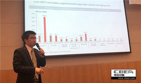 图为中国·动力电池应用分会秘书长、电池中国网CEO张雨发表演讲
