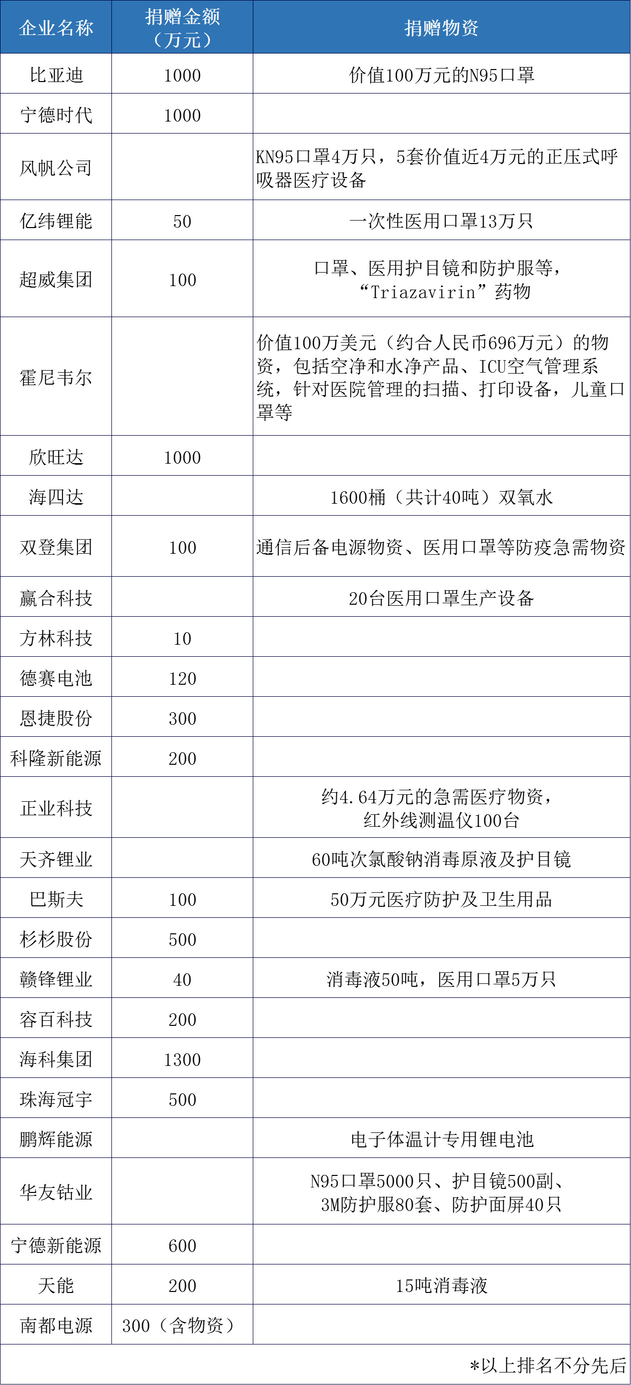 1月28日,比亚迪通过比亚迪慈善基金会向湖北省慈善总会捐赠爱心资金人民币1000万元,用于支持防控新型冠状病毒感染肺炎疫情。1月31日,比亚迪海外分公司发挥其驻地优势,协调国外资源,采购价值100万元的疫情防控物资N95口罩,为奋战在抗击疫情第一线的人员提供支持。1月27日,宁德时代向湖北省红十字会捐款1000万元,善款将由疫情防控指挥部统一调配使用,全部用于疫情地区前线抗击以及防治工作。近日,风帆销售公司向武汉地区经销商发送KN95口罩4万只,后续捐赠的防疫物资将根据采购合同继续履行(目前受制于合同方的履行能力)。1月26日,风帆公司将5套价值近4万元的正压式呼吸器医疗设备和部分防疫口罩无偿捐赠给保定市卫健委。2月1日,风帆公司从辽宁省沈阳市紧急采购、长途运输的防疫消毒物资,为各单位复工前后抗击疫情提供有力保障。 1月26日晚,亿纬锂能接到客户对静音发电车的需求后,立即调配车辆,于27日上午完成交付,为武汉火神山医院5G基站的调测及正常开通提供了电力保障。1月31日,亿纬锂能再次筹集了一批N95口罩及12万只医用口罩,捐赠给荆门及惠州的医院,驰援疫情防控。此前,亿纬锂能已捐赠荆门高新区医院50万元及1万只医用口罩,为疫情防控提供支持。1月31日,亿纬锂能仅用4天时间便成功交付第一批红外测温仪专用电池,紧急发往广州对抗疫情,客户于2月1日成功签收。德国超威孵化器公司已采购1万只口罩,并将继续采购医用护目镜和防护服运往国内。超威俄罗斯石墨烯研发中心(超威集团与俄罗斯知名研发机构合作的新材料研发机构)与超威总部联系后,采购了一批口罩及一种叫“Triazavirin”的药物,该药物主要作用机理是抑制肺炎病毒RNA的合成和基因组片段的复制。目前,该研发中心首批口罩和药品已在1月31日通过DHL发往长兴县红十字会,2月1日第二批药品已寄出,第三批防护用品也将陆续寄出。2月2日,超威向长兴县慈善总会捐款100万元,加上超威海外公司和研究院采购的大批医护用品,一起驰援疫情前线。霍尼韦尔捐赠价值100万美元(约合人民币696万元)的物资,全力支持武汉医院抗击新型冠状病毒。捐赠物资包括空净和水净产品、ICU空气管理系统,以及针对医院管理的扫描、打印设备,另外还包括赠予武汉相关学校的霍尼韦尔儿童萌宠口罩。1月30日,欣旺达通过深圳市红十字会向湖北等疫情重灾区捐赠1000万元现金,专项用于一线抗击和防治新型冠状病毒疫情工作,为一线医护人员、公众尤其是湖北等疫情重灾区人民提供有力援助。2月2日,海四达集团向启东市红十字会捐赠1600桶(共计40吨)消毒用双氧水。1月25日,双登集团驰援武汉火神山医院首个楼面通信基站建设,向中国铁塔武汉分公司捐赠通信后备电源物资,保障救护通道第一时间畅通。同期,双登集团启动海外物资采购行动,通过海外公司、海外本地员工及合作伙伴等多种渠道,紧急采购医用口罩等防疫急需物资,用于后期捐赠或援助。1月30日,双登集团向湖北省枣阳市红十字会捐助现金20万元。2月6日,双登集团向江苏省泰州市姜堰红十字会捐助现金80万元。截至日前,双登集团现金捐款共计100万元。春节期间,赢合科技紧急开发生产医疗平面医用口罩全自动一体机,并与振德医疗用品股份有限公司签署合作协议,合作开发KN95口罩(M95)全自动生产线。目前,赢合科技已初步与深圳市政府达成了第一批医用口罩生产设备的供应协议,争取以最快的速度完成100台设备的交付,并优先捐赠20台设备全力驰援疫区。2月1日,苏州方林科技股份有限公司向江苏苏州高新区红十字会捐款10万元人民币用于高新区疫情防控和治疗,包括购买医用物资、进行医疗建设以及医护人员生活物资补助等。德赛电池及其子公司蓝微电子,各认捐60万元(共计120万元),专项用于抗击新型冠状病毒感染的肺炎疫情,驰援惠州及武汉等地。1月29日,恩捷股份向玉溪市红十字会、上海市慈善基金会、无锡市锡山区厚桥街道慈善会、高安市红十字会、珠海市红十字会合计捐赠人民币300万元,支持抗击新型冠状病毒感染的肺炎疫情防控工作。2月2日,河南科隆新能源股份有限公司向新乡市红十字会捐赠200万元,用于新乡市新型冠状病毒肺炎疫情防控工作。2月5日,广东正业科技股份有限公司发起在线募捐活动,全体员工积极参与疫情阻击战,目前筹集资金4.64万元,募捐资金将用于购买急需医疗物资,为疫情防控攻坚战贡献力量。此外,其子公司深圳鹏煜威向广东省陕西汉中商会捐赠价值1.9万元的红外线测温仪100台,用于支持陕西汉中疫区抗击新型冠状病毒肺炎疫情。2月5日,天齐锂业向四川省以及重庆市的医疗机构、工业园区、社区等捐赠60吨次氯酸钠消毒原液,并通过彤程公益基金会捐赠护目镜至武汉医疗一线,以实际行动支援抗疫一线。2月5日,巴斯夫向上海市慈善基金会捐款100万元人民币,定向支持该基金会设立的抗击新型冠状病毒肺炎疫情专项项目。此外,巴斯夫通过全球采购,为上海、南京、重庆、湛江等主要生产基地所在社区捐赠价值超过50万元的医疗防护用品及卫生用品,支持当地政府、社区及医院对抗疫情。1月29日,杉杉股份向宁波市慈善总会捐赠现金500万元,全力支持疫情防控工作,捐赠资金将用于宁波市医务、救援人员、患者,及医用耗材物资的采购。近日,赣锋锂业向湖北武汉、江西新余等城市捐赠消毒