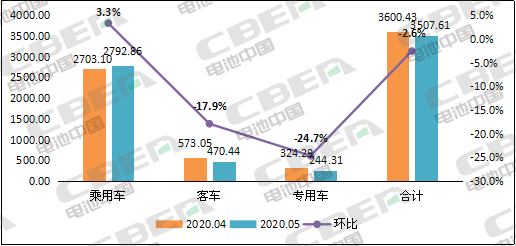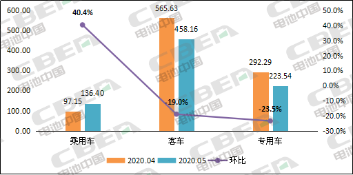 从车辆类型来看,2020年5月新能源乘用车搭载的动力电池装机量约2.79GWh,环比增长3.3%,占比79.6%,较上个月提升4.5个百分点;新能源客车搭载的动力电池装机量约0.47GWh,环比下降17.9%,占比13.4%,较上个月下滑2.5个百分点;新能源专用车搭载的动力电池装机量约0.24GWh,环比下降24.7%,占比7.0%,较上个月下滑2个百分点。