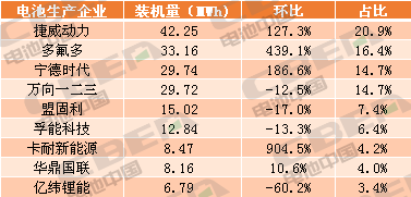 4月份排名前十的电池生产企业分别为宁德时代、LG化学、比亚迪、中航锂电、时代上汽、国轩高科、力神、亿纬锂能、鹏辉能源、塔菲尔。