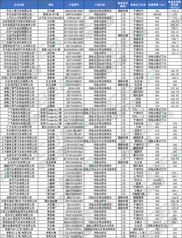 从主机厂来看,特斯拉(上海)、上汽大众、一汽大众、东风本田、广汽本田、东风悦达起亚等多家外资及合资车企均有车型入选,这或将给国内自主主机厂带来巨大的压力和挑战。其中,上汽大众的ID.4、东风本田的M-NV首次入选推荐目录,续航里程分别为555km和480km。