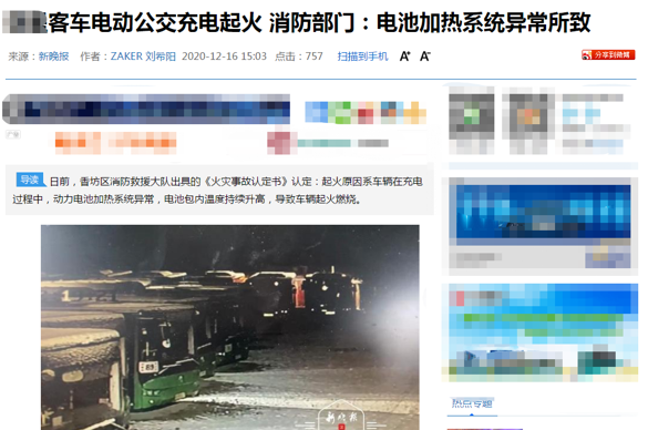 近日,哈尔滨一辆纯电动客车在露天车库充电过程中起火。消防救援大队《火灾事故认定书》认定:起火原因系车辆在充电过程中,动力电池加热系统异常,电池包内温度持续升高,导致车辆起火燃烧。
