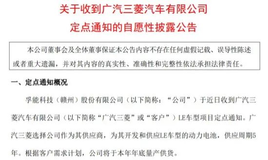 图为孚能科技获广汽三菱定点公告
