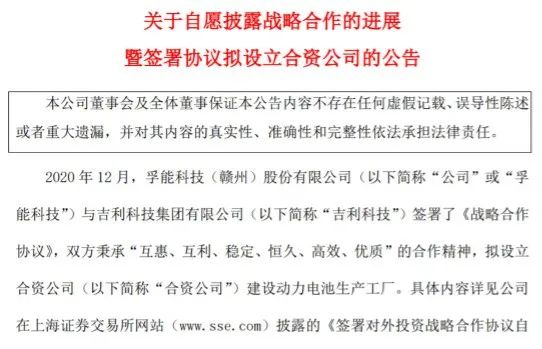 图为孚能科技与吉利科技签署合资协议公告