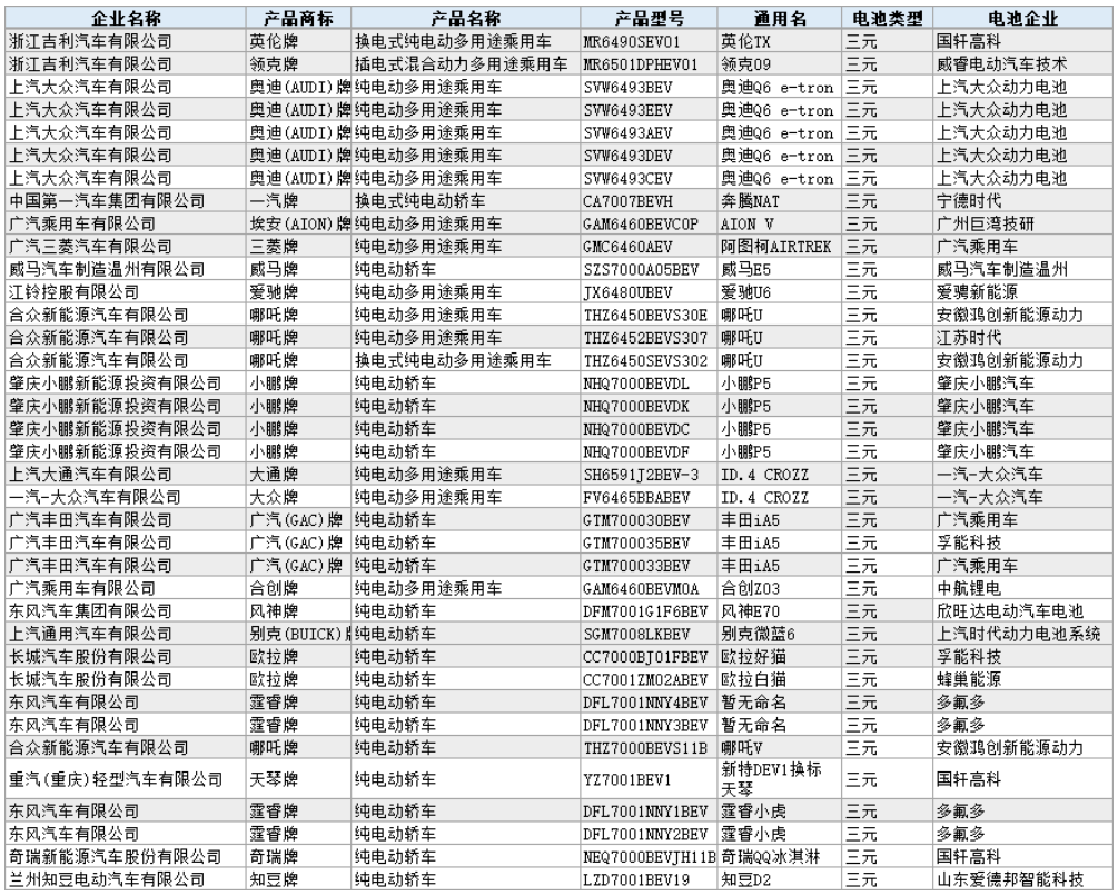 另外,从上表可以看出,上汽大众、一汽大众、上汽通用、广汽三菱、广汽丰田等合资品牌在中高端车型上仍偏爱三元电池。其中,上汽大众申报了5款奥迪牌乘用车,均为奥迪Q6 e-tron 纯电车型,电芯供应商未披露;广汽丰田使用的是孚能科技的三元电池。其他几家合资品牌的电芯也未披露,需要等到正式公告发布时方能揭晓。