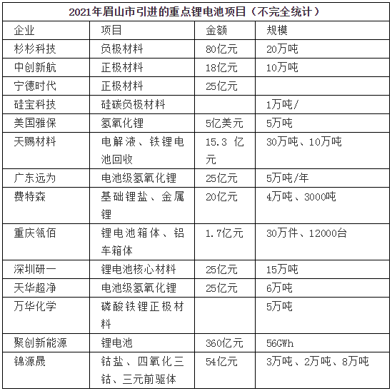 电池中国不完全统计了2021年眉山市引进的另一些重点项目:
