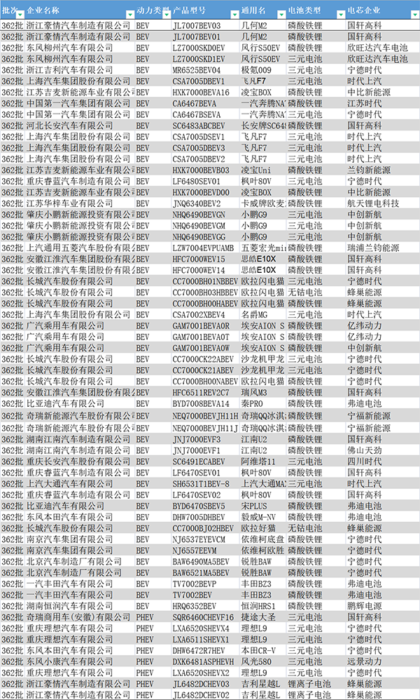 第362批《道路机动车辆生产企业及产品公告》新能源乘用车申报车型及电池信息