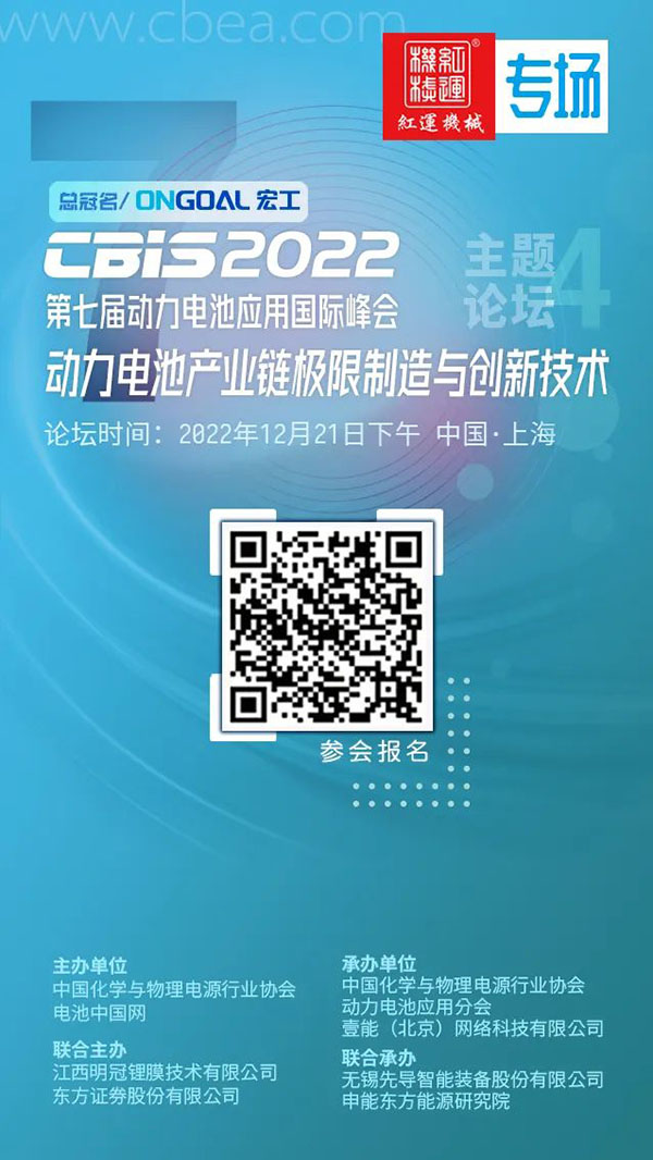 12月19日-12月22日,第七届动力电池应用国际峰会(CBIS2022)将在上海举办。本届峰会由宏工科技总冠名,中国化学与物理电源行业协会、电池中国网主办,明冠锂膜、东方证券联合主办,动力电池应用分会、壹能(北京)网络科技有限公司承办,无锡先导智能、申能东方能源研究院联合承办。