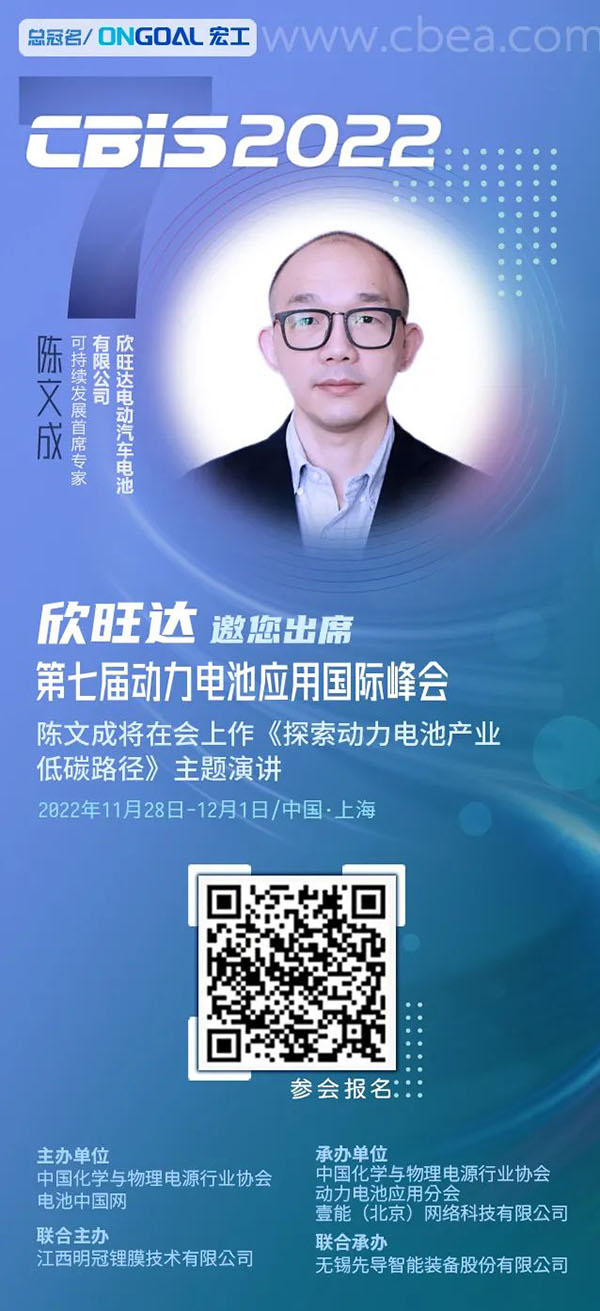 欣旺达对第七届动力电池应用国际峰会(CBIS2022)给予重点支持。届时,欣旺达电动汽车电池有限公司可持续发展首席专家陈文成将出席峰会并作“探索动力电池产业低碳路径”的主题演讲,分享欣旺达在产业减碳新技术、低碳新应用等方面的见解及其最新解决方案。