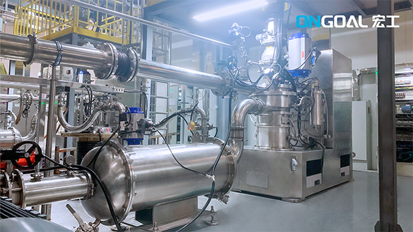 据介绍,宏工科技新一代双螺杆式连续制浆系统,在螺杆中完成主辅料、溶剂、binder等加入,因此在螺杆中即可实现干混、捏合、分散、除气等多工艺功能,各成分粉料呈弥散状态进入螺杆,加速了浸润、分散,制浆效率进一步提高。