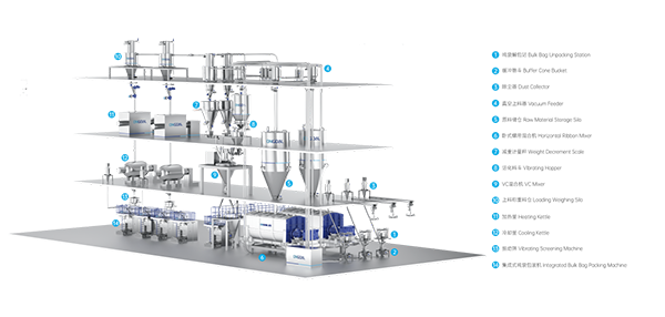 例如,锂电正负极材料生产线(整线集成)方面,为磷酸铁锂、三元等正极材料,以及石墨、硅基等负极材料生产提供智能制造一体化解决方案,包括犁刀混合机、螺带混合机、低速釜式干燥机、砂磨机、集成式吨袋包装机等自主研发的核心设备。
