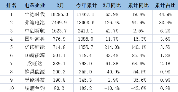 电池中国梳理今年2月中国市场TOP10电池企业装机情况如下: