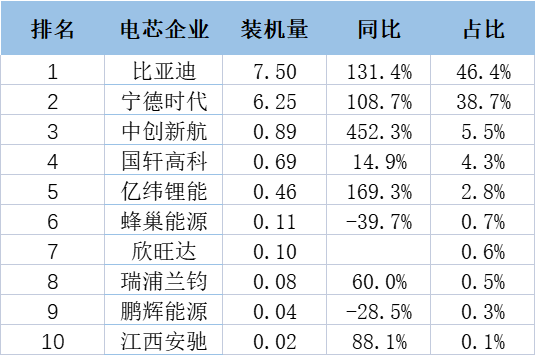 中国市场2月装机量TOP10依次为宁德时代、弗迪电池、中创新航、国轩高科、亿纬锂能、LG新能源、欣旺达、蜂巢能源、孚能科技和瑞浦兰钧。