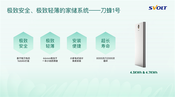 目前,家储产品普遍体积庞大、笨重、空间占用大。本次展会上,蜂巢能源基于L600型168Ah储能电芯,推出厚度仅为66mm的家用储能产品,采用短刀电芯和刀锋设计,实现了极致安全和极致轻薄,带电量有4.3KWh & 4.7KWh两款可供选择,循环次数可达12000次,产品简约、大气,像家电一样便捷、实用、美观。