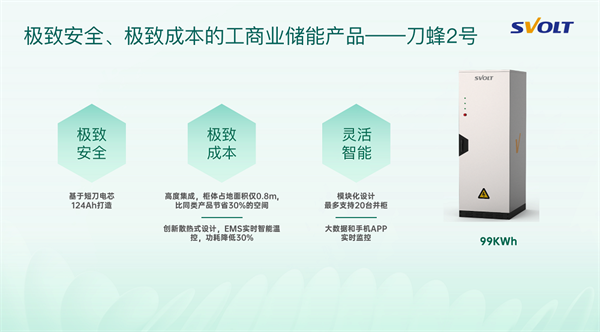 99KWh工商一体储能则基于L600型124Ah短刀电芯开发,集电池、BMS、PCS、EMS、空调和消防系统于一体。该产品颗粒度小、功能完善、积木式拼接,应用场景更加广泛;缩小了家庭和工商业储能界限,具有高度集成、灵活扩容、高效冷却、智能监控等优势。