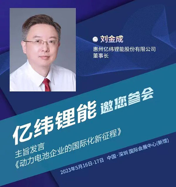 5月16日-17日,第四届新能源汽车及动力电池(CIBF2023深圳)国际交流会将在深圳国际会展中心(新馆)5-7馆间会议室举办。在16日上午的【开幕式】上,惠州亿纬锂能股份有限公司董事长刘金成将带来主题为《动力电池企业的国际化新征程》的主旨发言。敬请关注!