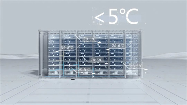据介绍,欣旺达5MWh液冷储能系统采用高效智能液冷温控系统,使得系统层级温差小于5℃,系统温度一致性显著提升,温升明显降低,提升系统循环寿命10%,降低辅助功耗20%。配合智能管理、智能投切、智能保护等功能,实现系统的极简运维和经济高效。