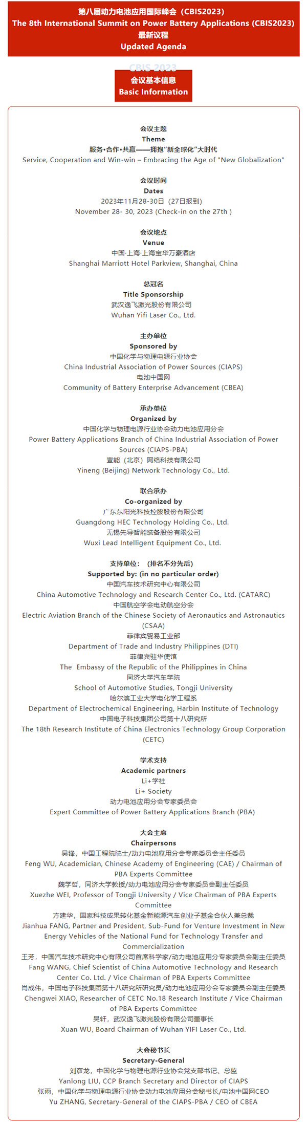 欢迎产业链相关企业、科研院所、证券等资本市场,特别是大型电池/材料企业、设备/仪器及周边服务的相关单位,对本届峰会给予赞助支持,共同合作,携手前行。有关峰会赞助、会刊广告、展板广告及现场展位等具体事宜,请联系大会组委会。