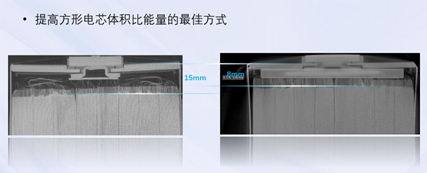 据介绍,“问顶电池”的创新之处在于缩短极耳长度,改变其与转接片的连接方式,采用一体化焊接技术,使得电芯内部结构实现了一体化的连接,把原有的顶部空间由15mm缩减到了8mm,使电芯内部空间利用率有效提升7%以上。