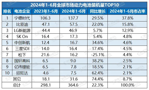 从全球市场动力电池装机量TOP 10来看,今年上半年,宁德时代(中国)以137.7GWh的装机量稳居首位,同比增长29.5%,市占率37.8%;比亚迪(中国)以57.5GWh的装机量排名第二,同比增长22.0%,市占率15.8%;LG新能源(韩国)的电池装机量为46.9GWh,市占率12.9%,排名第三。