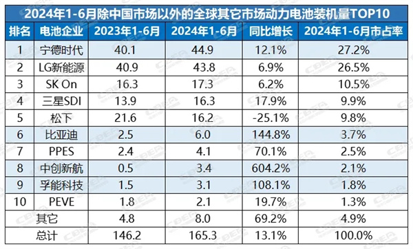 SNE Research数据显示,2024年1-6月,海外市场(除中国市场以外的全球其它市场)电动汽车动力电池装机量约为165.3GWh,同比增长13.1%。