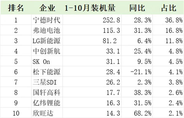 2024年1-10月全球动力电池装机量TOP10(单位:GWh )