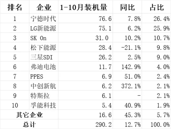 数据显示,今年1-10月,海外市场动力电池装机量约为290.2GWh,较去年同期增长12.7%。