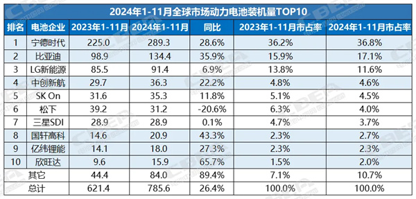 2024年1-11月全球市场动力电池装机量TOP10分析