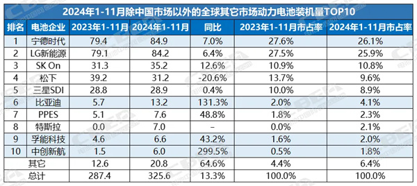 数据显示,2024年前11个月,海外市场动力电池装机量约为325.6GWh,同比增长13.3%。