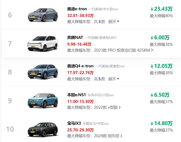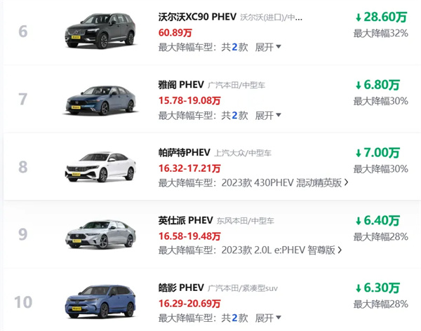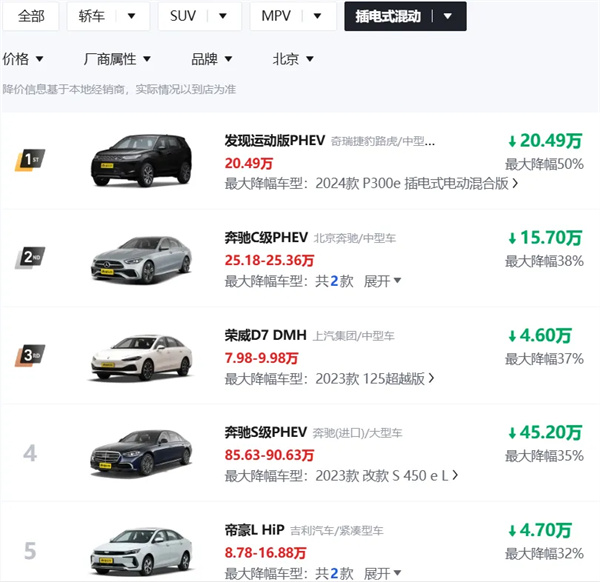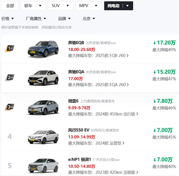 截至2月17日上午,懂车帝公布的新能源汽车最新降价信息显示,以纯电和插混(不含增程)车型为例,最大降幅约50%。其中,有50款纯电车型降幅≥20%,有20款插混(不含增程)车型降幅≥20%,且包括头部车企的一大批主力车型均在降价行列!