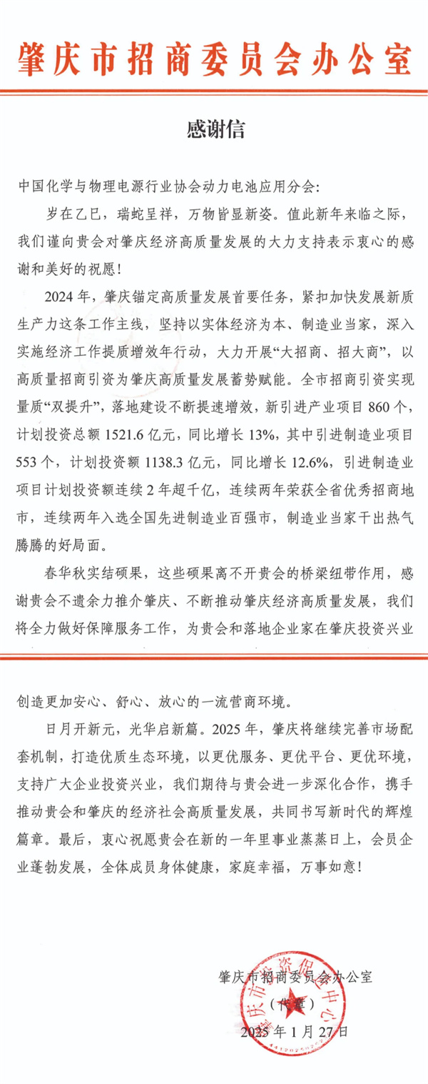 以下为肇庆市招商委员会发给电源行业协会动力电池应用分会的感谢信全文: