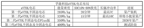 据介绍,孚能科技已量产装机的第一代eVTOL半固态电芯,能量密度达285Wh/kg,-20℃低温容量保持率90%。其配套的eVTOL最高时速达320km/h,单次最长巡航250km。
