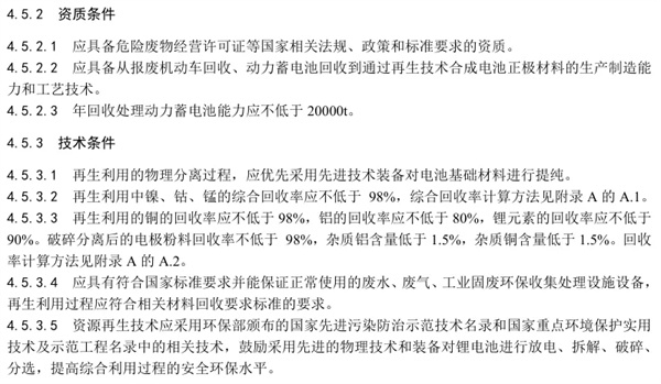 资质条件和技术条件方面,要求再生利用企业年回收处理动力蓄电池能力应不低于20000t。再生利用中,镍、钴、锰的综合回收率应不低于98%。