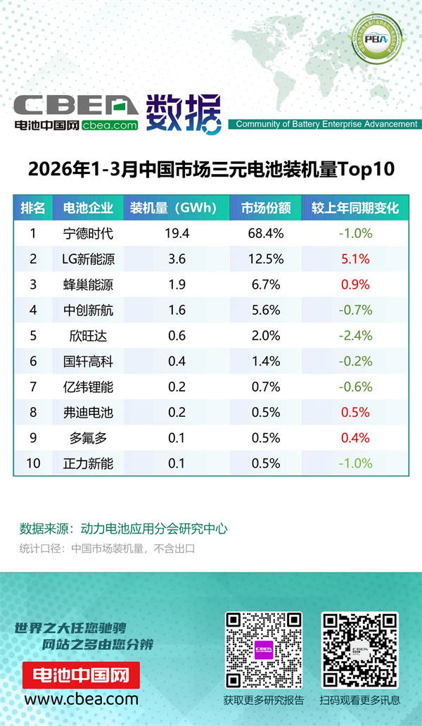 1-3月中国市场LFP/三元电池装机量Top10
