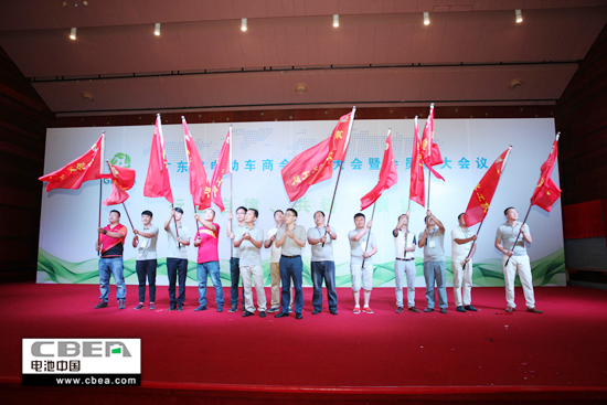 7月13日下午,广东省电动车商会成立大会暨第一次会员扩大会议在广州白云国际会议中心隆重举行。图为为义工队授旗。