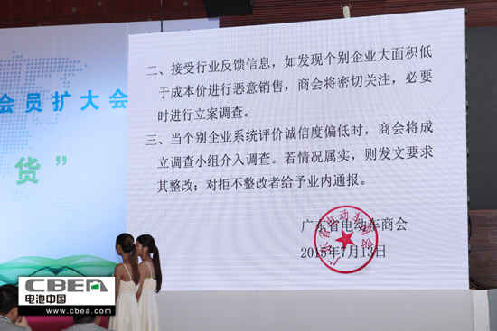 7月13日下午,广东省电动车商会成立大会暨第一次会员扩大会议在广州白云国际会议中心隆重举行。图为商会发布行业自律性文件。