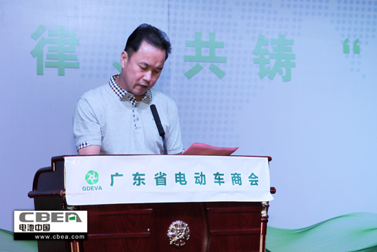 图为广东省电动车商会首任会长孙木钳介绍商会情况