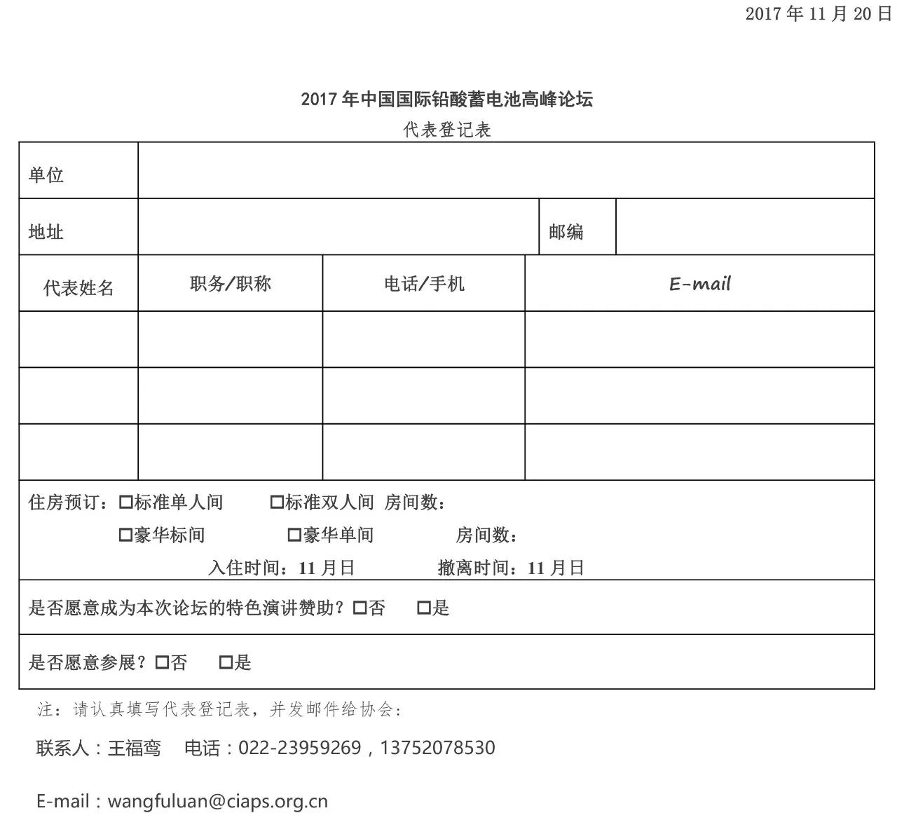 附件:2017年中国国际铅酸蓄电池高峰论坛代表登记表