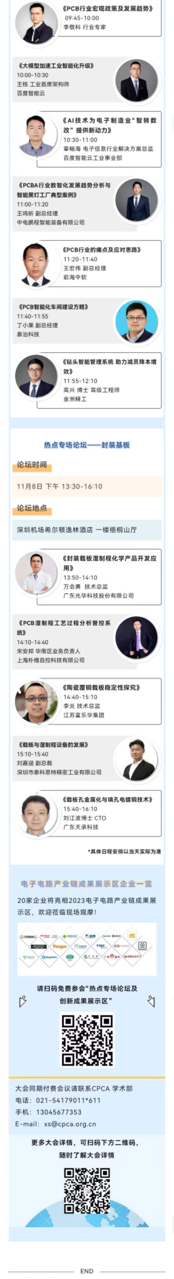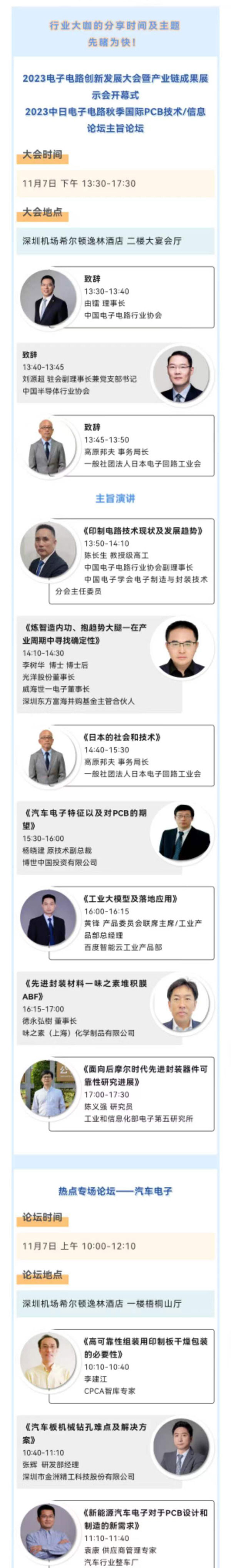 来自味之素、百度智能云、富乐华、东硕科技(光华科技成员企业)、金洲精工、花园新能源、江南新材、菲希尔、盘古信息、水清环保、泰科思特、中科计算机软件、多普光、泰治科技、天承科技、炎墨、轩明视、广东盈华、苏美达等行业专家,将通过开幕式、主旨论坛、热点专场论坛(汽车电子、绿色环保、智能制造、封装基板)大会同期论坛平台与行业同仁分享行业的新技术、应用案例及解决方案,就PCB行业新技术、新应用、发展趋势展开探讨交流!