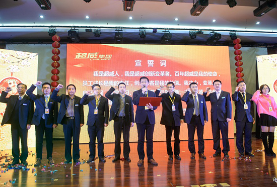 会上,杨新新总裁代表董事会作工作报告,回顾总结了创新变革、成绩辉煌的2015年。行业龙头地位更加稳固,市场占有率达到43%;持续发展后劲不断增强;创新变革实现重要突破,总部和试点单位实施课题298项,取得了良好效益;技术研发取得较大进展,一项专利荣获全行业、全市首个中国专利金奖。国家千人计划专家总数达到3人;企业形象得到广泛认可,成功创建“全国企业文化示范基地”,董事长周明明荣获“第五届浙江省优秀中国特色社会主义事业建设者”,“浙江省功勋企业家”等荣誉称号,研究院名誉院长刘孝伟荣获“全国劳动模范”。同时指出,2015年成绩固然可喜,但问题和挑战仍然不少,从企业外部来看,面临的经营风险,前所未有。从企业内部来看,离顾客的需求,离员工的期望,离精细化管理的标准还有一定差距,产生这些问题的原因,是主动担当意识、协同协作意识、自我更新意识、忧患意识意识的不足。但我们仍要看到积极的一面,趋势好于形势,优势大于劣势,机会多于挑战。2016年,要围绕顾客和员工两个中心,做到六个领先:紧盯前沿、培育优势,持续巩固技术领先;关口前移、责任下沉,扎实推进质量领先;系统梳理、整体推进,着力构筑成本领先;做强品牌、拓展渠道,继续保持市场领先;顾客第一、满足需求,加快完善服务领先;以人为本、激发活力,大力促进人才领先。杨新新总裁给每一个超威人提出要求:从自我改变开始,在开拓进取中展现新面貌。他希望每一个超威人都能标杆引路,协同推进;关注机会,大胆创新;勇于变革,共同进步,推动超威向卓越企业跨越提升。
