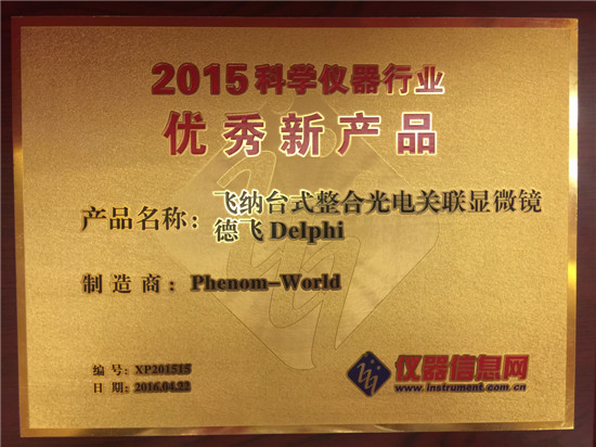 2016 年 4 月 22 日上午 9:00, 2016 (第十届)中国科学仪器发展年会 (ACCSI 2016),被誉为中国科学仪器行业“达沃斯论坛”,在北京京仪大酒店如期召开。飞纳台式整合光电关联显微镜德飞 Delphi 在本次年会上获得了由主办方颁发的 “2015 科学仪器优秀新产品” 奖。德飞使用户能在一台整合的显微镜 3 分钟内同时获得荧光和电镜图像,不需要在校准